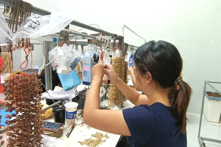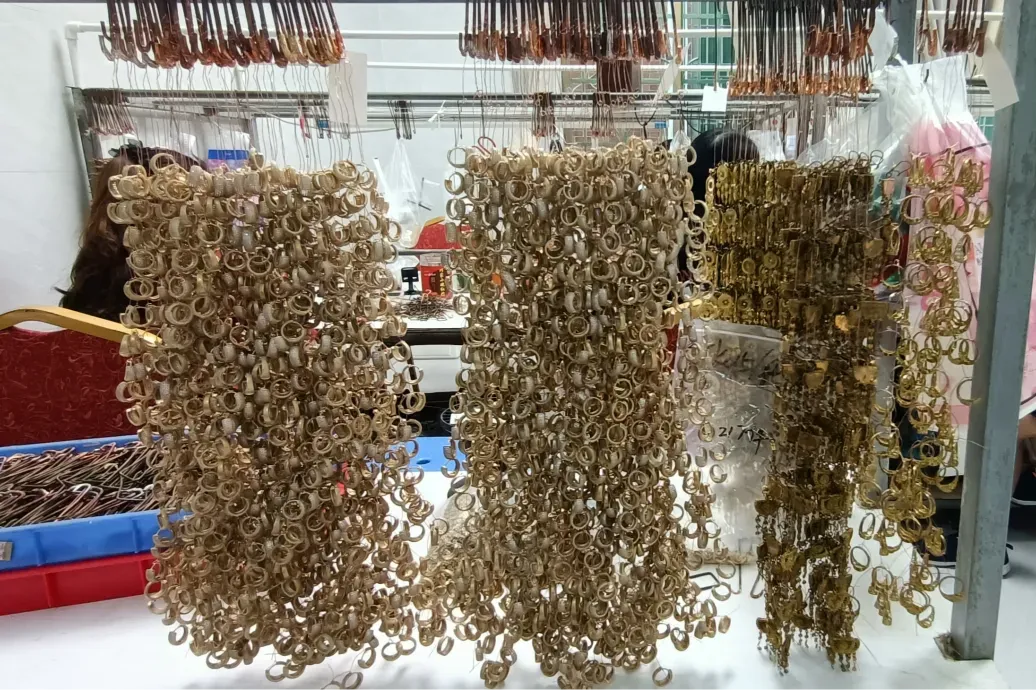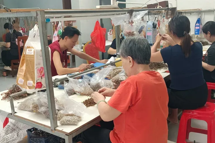 在南沙区横沥镇前进村,一大早,村民朱秀林家中已渐渐热闹起来。许多老人、妇女穿梭在朱秀林家的庭院中,欢声笑语时不时炸开来,仿佛一个喧嚣的集市。这一切,源于朱秀林带来的发展新思路。曾在外从事工艺品行业的她,带着订单和技术返回家乡,推行“分散式生产+集中质检”的模式:把穿珠、绕线、贴钻等技术要求较低的工序分包给村民,自己则负责对接厂家和把控质量。